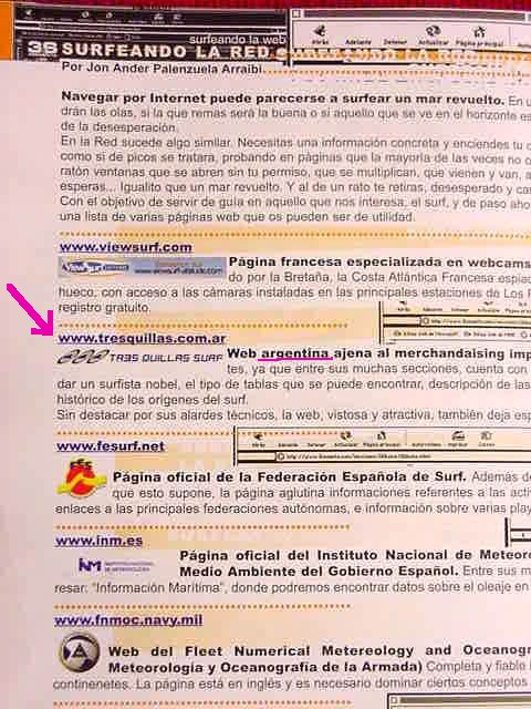 "Surfeando la Web, por Jon Anderson Palenzuela Arraibi" "Navegar por Internet puede parecerse a surfear un mar revuelto. En un baño de este tipo no sabes por donde vendran las olas, si la que remas sera a buena o si aquello que ves en el horizonte es una gran serie o tan solo un espejismo fruto de la desesperacion. En la Red suele suceder algo similar. Necesitas una informacion concreta y enciendes tu ordenador. Te mueves de un buscador a otro, como si de picos se tratara, probando en paginas que muchas veces no ofrecen lo que prometen, cerrando de golpes de raton ventanas que se abren sin tu permiso, que se multiplican, que vienen y van, aparecen y desaparecen, por donde menos lo esperas... Igualito a un mar revuelto. Y al rato te retiras, desesperado y cansado. Con objetivo de servir de guia en aquello que nos interesa, el surf, y de paso ahorrar un tiempo precioso en busquedas, ahi va una lista de paginas web que os pueden ser de utilidad:" "Tres quillas surf: Web argentina ajena al merchandising imperante en la red. Es ideal para principiantes, ya que entre sus muchas secciones cuenta con una destinada a los primeros pasos que debe dar un surfista nobel, el tipo de tablas que se puede encontrar, descripcion de las principales maniobras, asi como un resumen historico de los origenes del surf. Sin destacar por sus alardes tecnicos, la web, vistosa y atractiva, tambien deja espacio para una seccion sobre ecologia." * Aviso: los productos 3quillas solo se venden a traves de esta web y en el surf-shop Uluwatu de Bs.As. Si los conseguis en otro lado o provincia del interior del pais se trata de una imitacion y falsificacion (fuimos avisados de casos cómicos como en la prov. del Chaco, o casos ya mas llamativoss como en el de 3quillasshop en Malaga - España). * Busted: cansados de pedir que aquellas personas o webs que necesiten reproducir algun contenido de 3 quillas pidan la correspodiente autorizacion, y ademas mencionen la fuente consultada, decidimos abrir una seccion indicando nombre y direccion web de aquellos que nos copien descaradamente. Click aqui * Publicacion de direcciones de E-mail: tomamos la decision de no publicar mas direcciones de correo electronico ya que detectamos que varios "vivos" las recolectan y las usan para enviar publicidad indeseada a nuestros lectores. Eso se llama Spam y nos oponemos rotundamente a ese tipo de practicas compulsivas y molestas de hacer pseudo-publicidad. .::.::.::.::.::.::.::-.::.::.::.::.::.::.::.::.