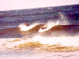 Foto:El surfista de la derecha tiene la prioridad por venir desde donde rompe la ola. El de la izquierda se está echando correctamente hacia atras para dejar pasar al otro surfista que tiene prioridad. Por Lucas Kohen-P.del Este Junio 2004.