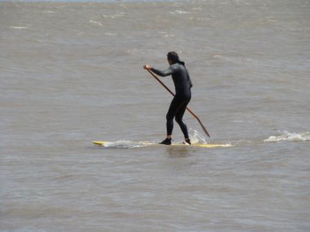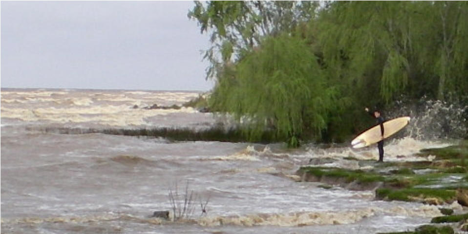 Sábado de Surf en Buenos Aires txt: Oscar Pedro Larghi Pix: Oscar Pedro Larghi oscarlarghi@hotmail.com Los surfistas del mundo siempre rezan por algún viento. En California piden por los “Santa Ana” winds, en Hawaii por los “Tradewinds”, y nosotros en Argentina oramos por el “Pampero”. Después de algún tiempo de surfear aprendes la rutina de un par de días de viento del sur y un swell que se acerca. Luego de haber vivido unos años en Mar del Plata (hace siglos, en la época pre-Internet!), cuando volví a Buenos Aires, sabía que luego de un Pampero tenía que cargar las tablas en el auto y partir para Mardel. Sabía que si seguía soplando del Sur, podría correr Waikiki, el Yacht, el Torreón o la Popu, y si el viento rotaba por tierra y se clavaba Noroeste, las sesiones clásicas en el Sur serían una fija: Ganancia total! Hace 10 años que volví de Hawaii y me instalé de vuelta en Buenos Aires, sabia que tendría que amigarme con el río para mantenerme medianamente vivo. Empecé haciéndome unos paddleboards con los que me mantenía en estado para no perder remada cuando iba a la costa, además con ellos agarras las ondulaciones del río o las olas de los barcos. Finalmente con mi Tandem empecé a investigar la “north shore” de la costa del Río de La Plata, en busca de las olas de las que había oído hablar desde principios de la década del ochenta cuando empecé a surfear. El mito urbano existe entre los surfistas porteños y el ex campeón argentino de surf Marcelo Ray, me lo confirmó un día cuando me contó que a principios de los setenta se tiraban a surfear frente a la Facultad de Arquitectura de la Universidad de Buenos Aires, en Ciudad Universitaria. Y la verdad que con sólo acercarte al río un día de viento Sur, o aún más con una Sudestada, se puede confirmar que al igual que en el mar, aquí también se forman olas, también es verdad que para agarralas necesitás el vehículo apropiado. Hace 4 años que patrullamos el río remando las canoas hawaianas y he ido descubriendo innumerables points que he disfrutado, como muchos otros, en soledad. El fin de semana pasado cuando, ahora sí con la ayuda de Internet, chequeé los mapas en “El Surfero” y vi que anunciaban 30 nudos de viento Sur. Sabía que iba a ser uno de "esos" días. Me apuré a terminar una SUP Board que estaba haciendo para un amigo y lo llamé diciéndole: ”Preparate este sábado, vas a bautizar la tabla, y es muy probable que con olas, así que rezá!” Mi amigo Hernán, uno de esos típicos surfistas porteños, padre de familia que trabaja de lunes a viernes y sueña con esos 15 días de surf en el verano, hace un tiempo que venía entrenándose con el paddleboard, pero aún no había visto el río con olas, por lo que mantenía un sano escepticismo... Y el día llegó, luego de una semana de calor intenso, el viernes el viento dio vuelta “Pampero”. Y aunque no llegó tan fuerte como lo previsto, fue lo suficiente como para dejar una olita de 1 pie, y unos 100 metros de recorrido.