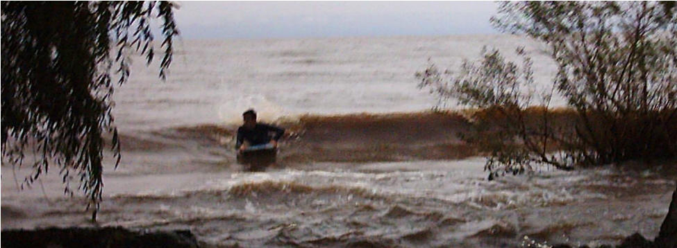 Se puede apreciar el efecto ondulador y acumulador de agua del viento Sud Este en las orillas occidentales del Rio de La Plata (Buenos Aires) mirando el nivel del agua en el árbol semi-sumergido de la derecha. Asi como el Pampero lleva por el contrario el agua y las olas hacia las costas orientales del Uruguay. La subida del nivel del agua y la ondulacion local generada por las fuertes ráfagas sostenidas de viento sud-este permite que imagenes como la de arriba se hagan realidad. A tener en cuenta: peligro del fondo oculto del Río traicionero con maderas, vidrios, piedras, escombros, ramas, alhambres y demás "regalitos" dejados por el Hombre. Protecciones como botitas son fundamentales, más allá del abrigo contra el frío. Otro efecto del Sud Este es el de acumular la basura que flota sobre el Río, en sus orillas.
